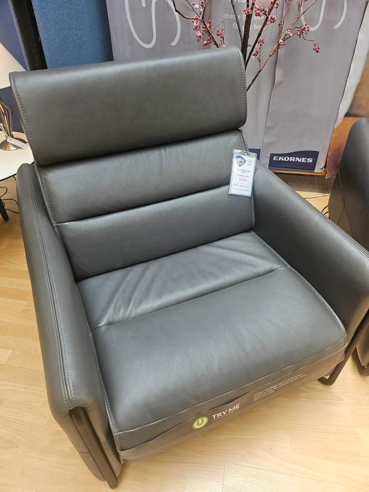 With full power recliner and headrest option. Top of the range Stressless power chair at less than half price. We have the matching power sofa in-store too. With its sleek lines and modern aesthetic, the Stressless Emily offers a welcoming and contemporary appeal. Soft, enveloping cushions invite you to sit back and unwind in comfort. Each seat module features an adjustable headrest and is available with either a fixed seat-back or built-in motors for personalised adjustment of back and leg support. Customise the look further by choosing armrest details in either steel or wood. For a coordinated living space, pair the Stressless Emily sofa with the Stressless Tokyo or Stressless View recliners.
