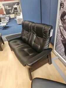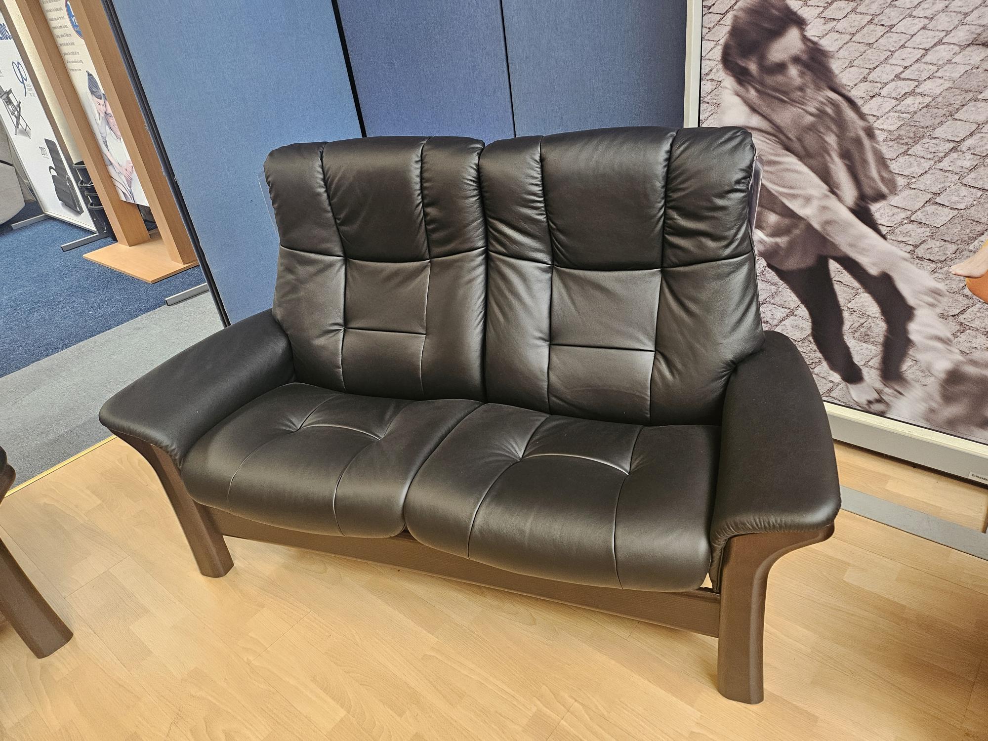 Luxurious Stressless Buckingham 2 seater reclining sofa, in stunning Paloma Black leather with dark Wenge wood.