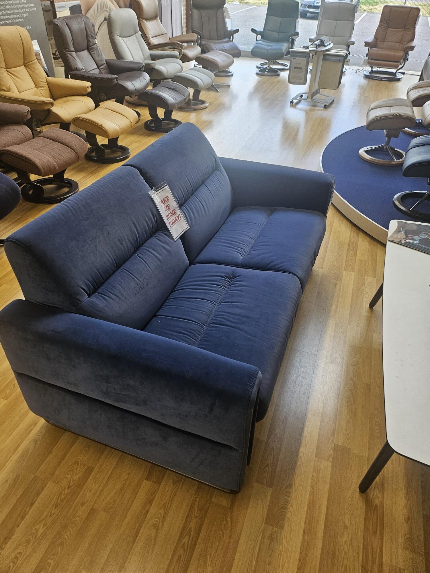 This sofa would work beautifully as a statement piece in a living room — the electric blue colour draws the eye, but the clean lines and walnut detailing keep it sophisticated.