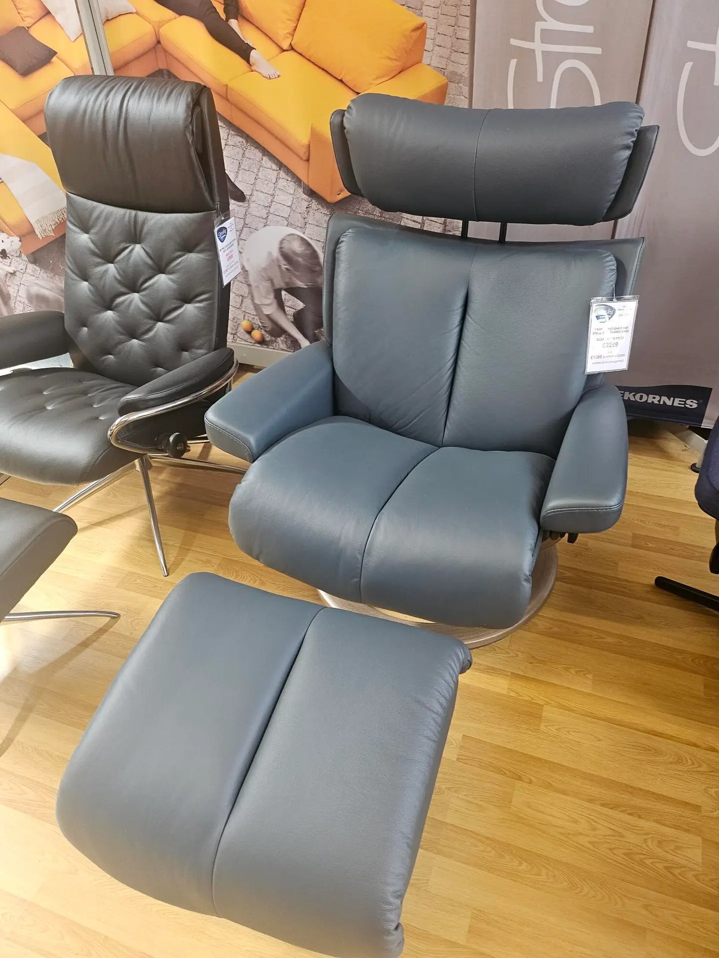 Outstanding Flagship Stressless Magic Classic Chair with Footstool in Beautiful Atlanta Blue Batick Leather on a Walnut Classic base. You wont find this chair at a better price!
