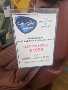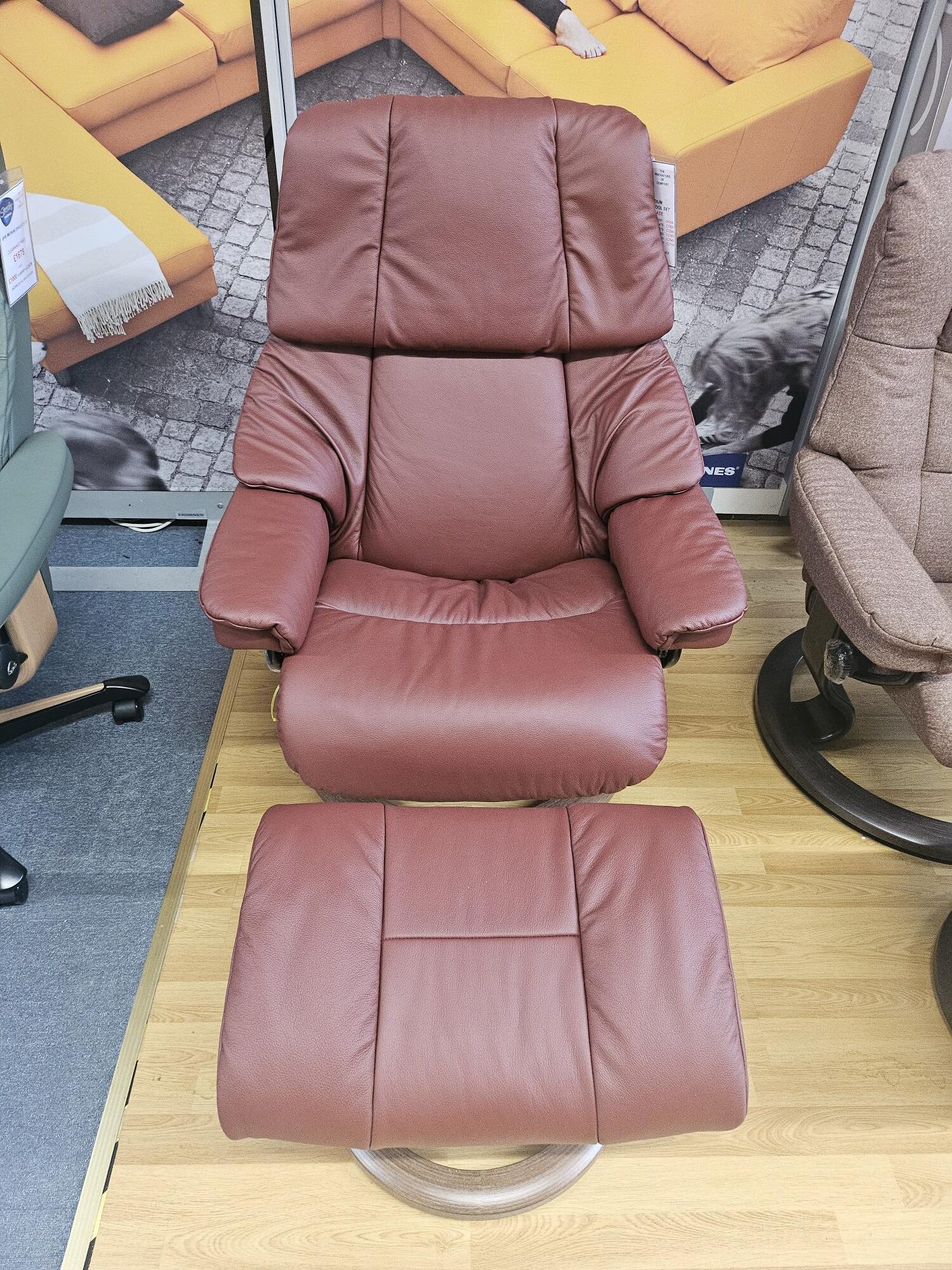 The Reno is a classic Stressless recliner paired with a matching footstool. It’s offered in three sizes — Small, Medium, and Large — and the Medium model provides a well-balanced fit that suits most users without feeling too compact or too large.