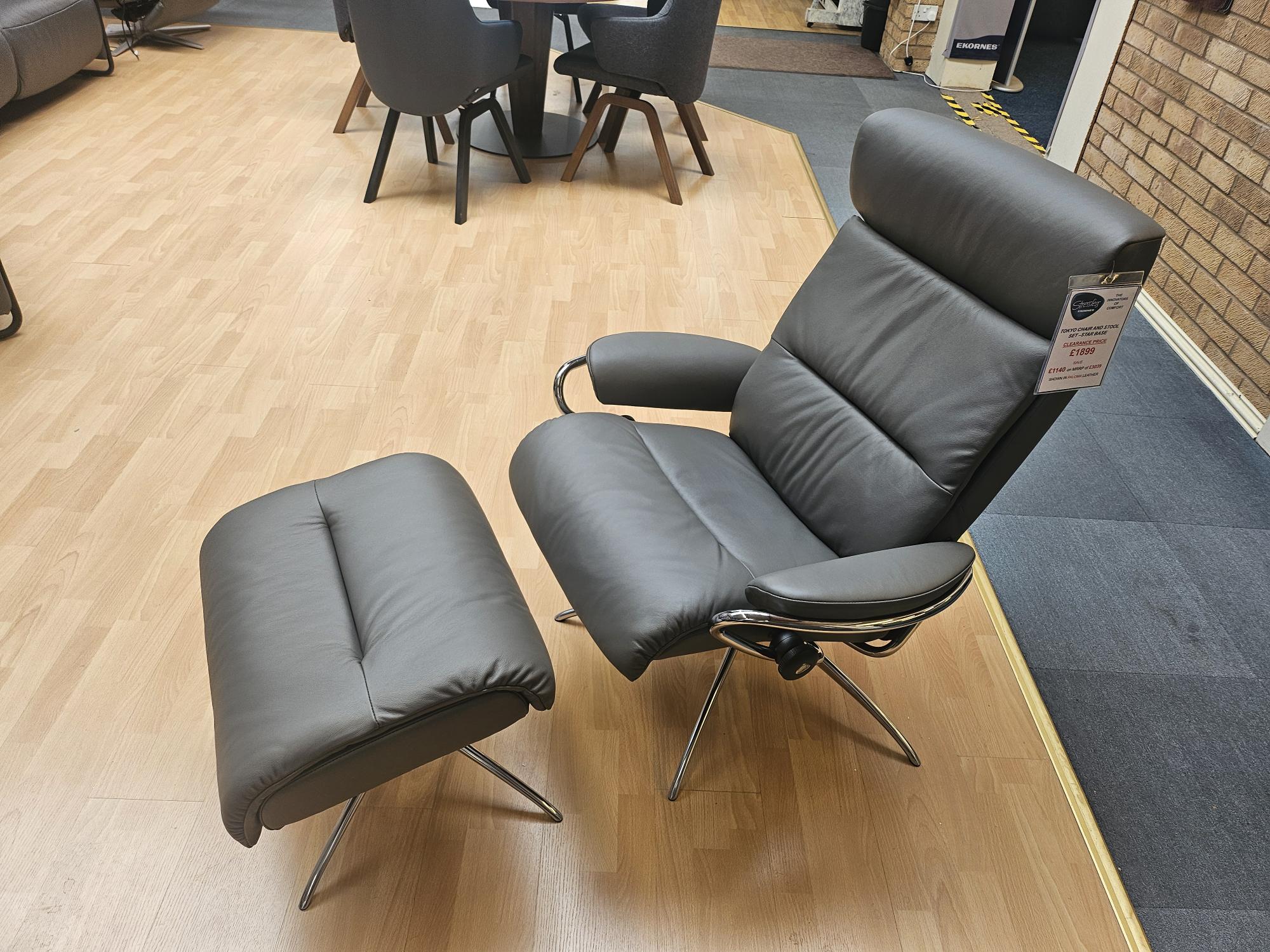 Tokyo Medium Star base chair and stool set in the Stunning Metal Grey Paloma Leather, with Chrome base. One left at this price!