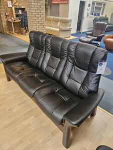 Luxurious Stressless Windsor 3 seater reclining sofa, in stunning Paloma Black leather with dark Wenge wood.