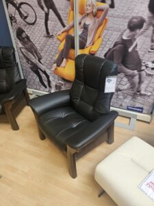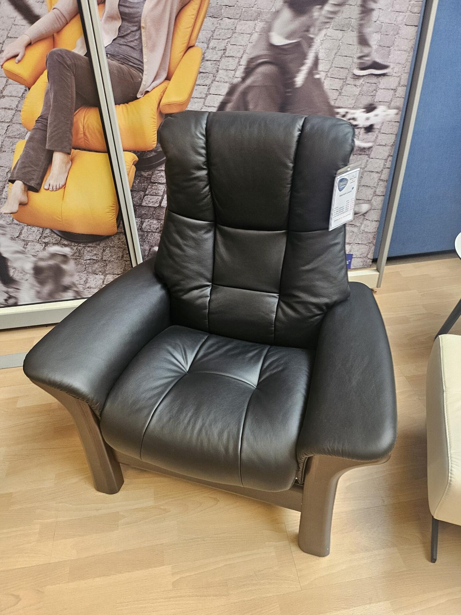 Luxurious Stressless Windsor recliner chair, in stunning Paloma Black leather with dark Wenge wood.